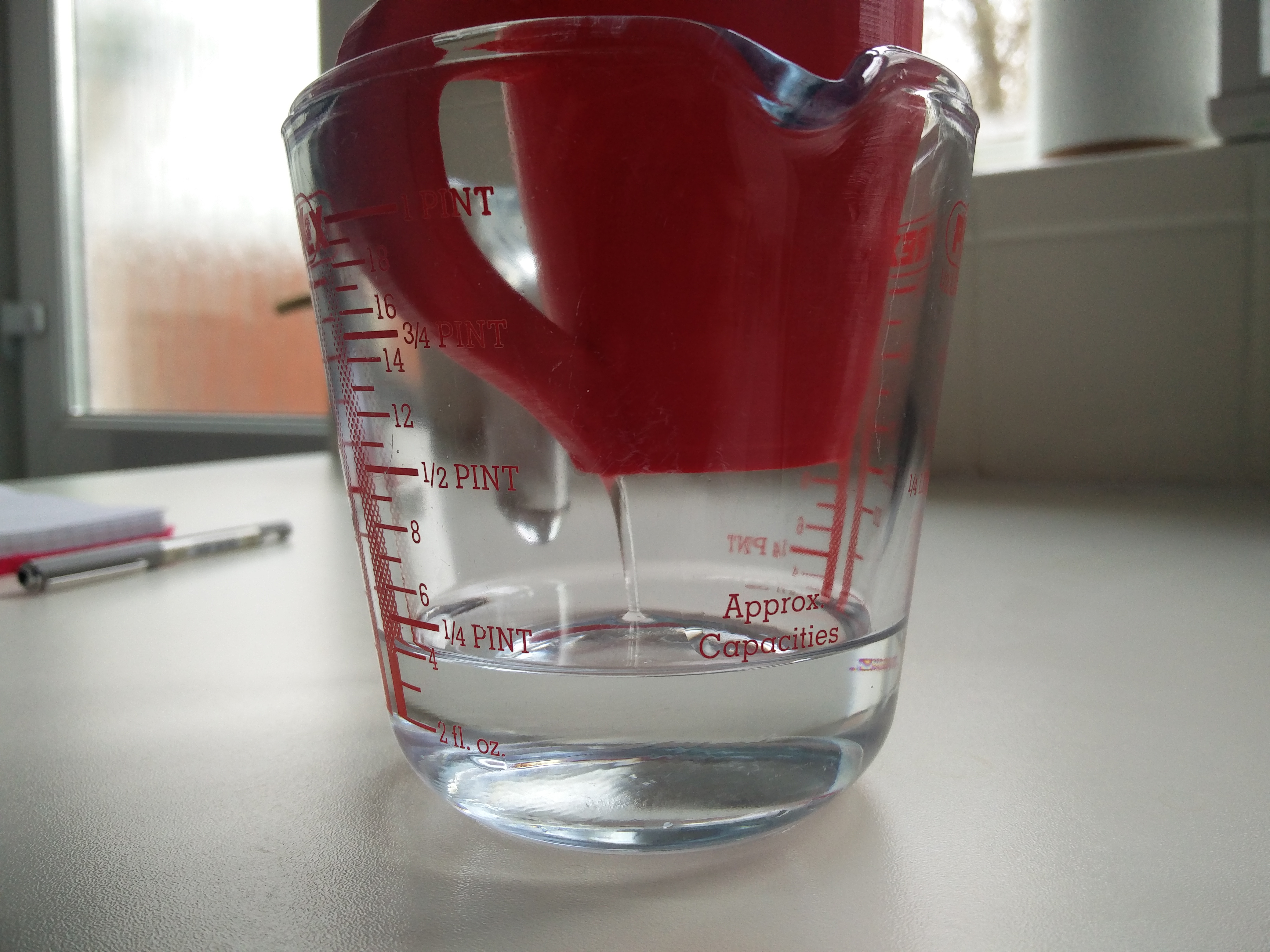 While this was printing, "mrfusion" in the Hacker News comments mentioned that he had made a Pythagorean cup before, and was disappointed that it took a long time to drain. It apparently "wasn’t very impressive to wait 30 seconds while the water trickled out. Just seems like a leaky cup".