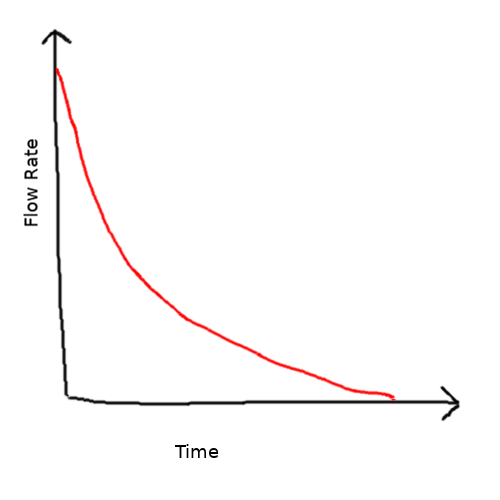 (I think it drops exponentially, and cuts off at the point where the level in the cup drops below the top of the pickup of the siphon).