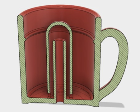 Note that the internal diameter at the bottom of the mug is even smaller than it appears from the outside. This serves the dual purposes of creating space for the tube inside the handle, and reducing the volume of water in the low-flow-rate region of the mug.
