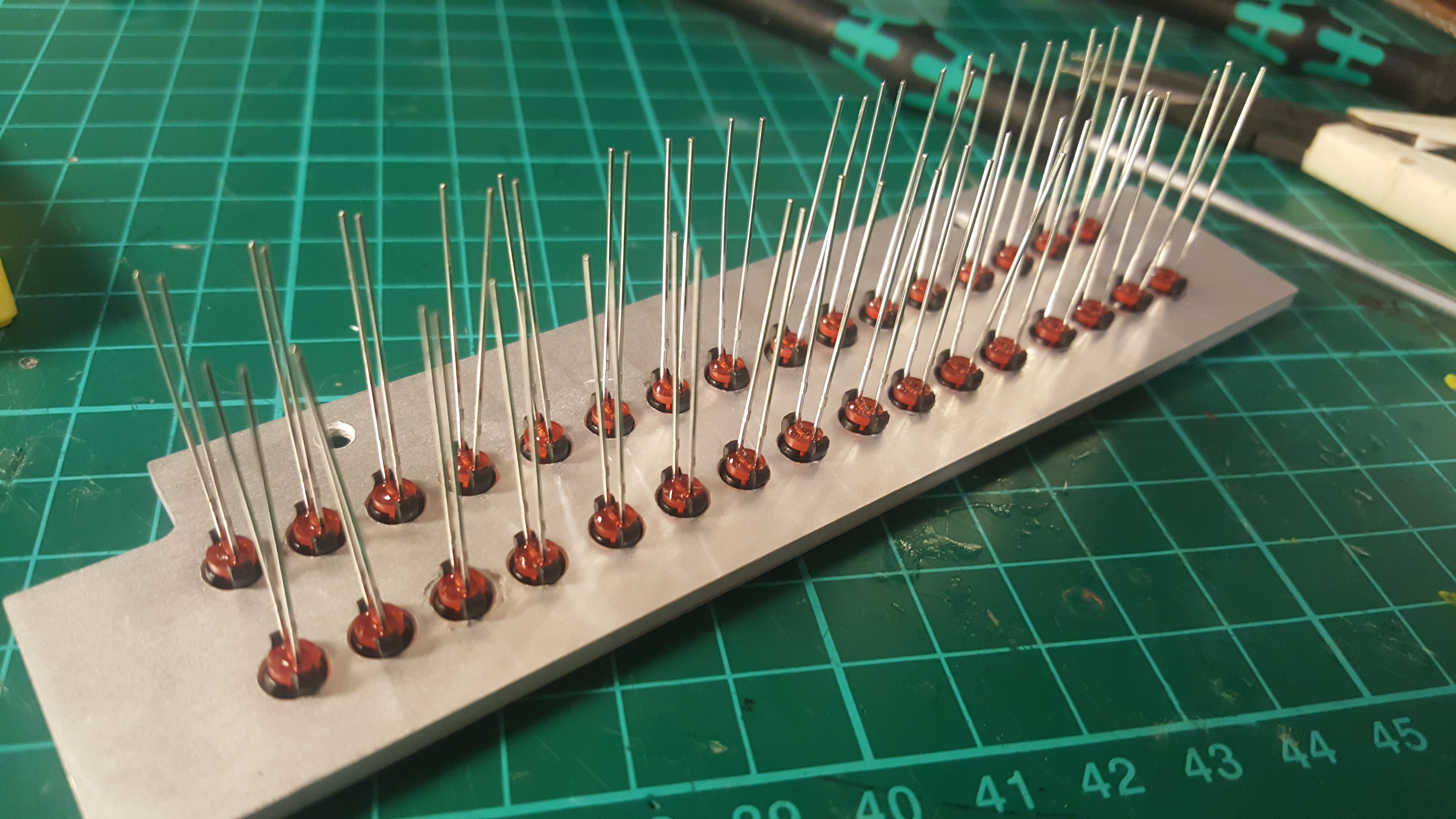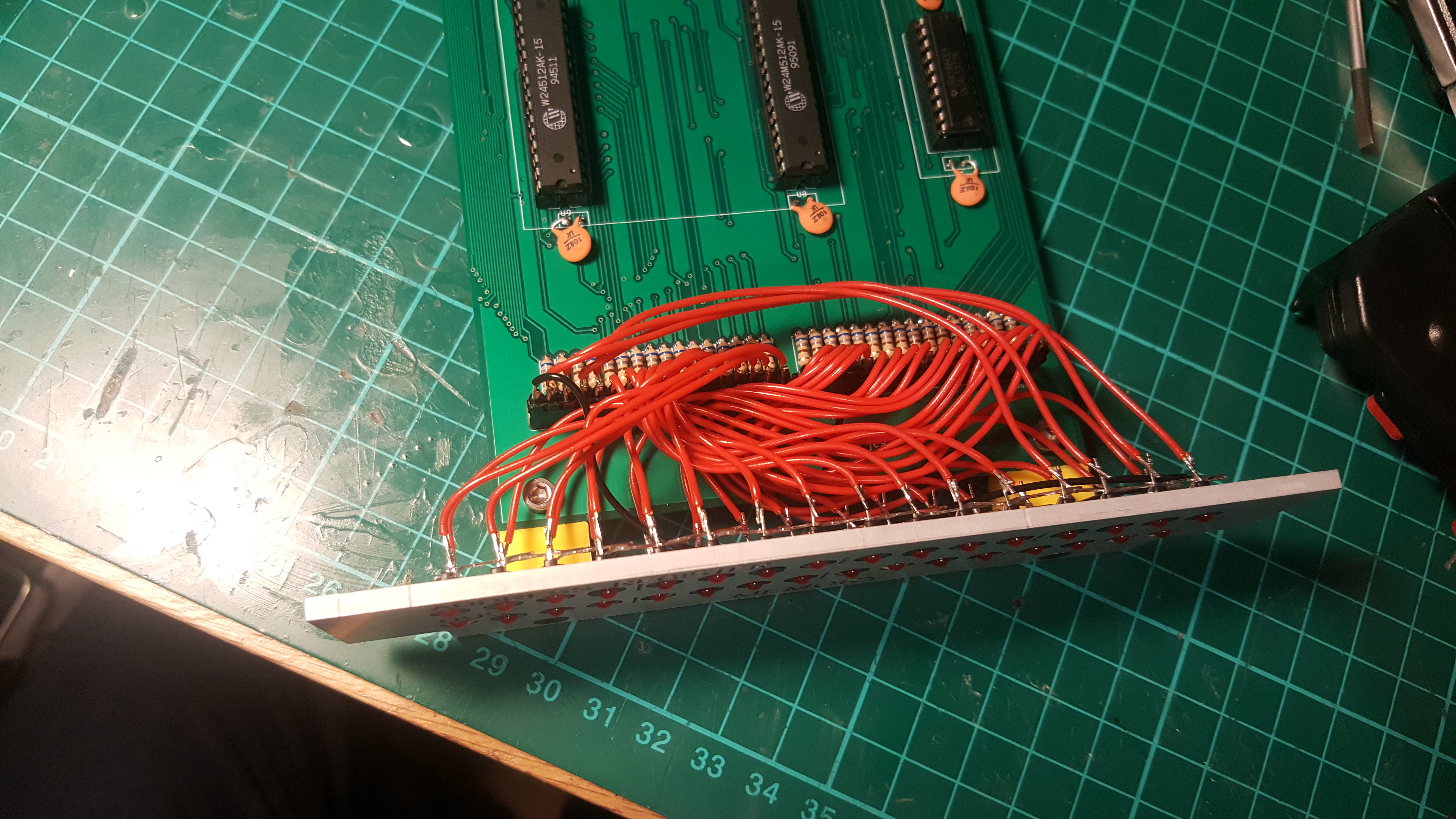 I found that soldering the wires for the LEDs was extremely boring and time-consuming. I still have more than 80 left to do on the other cards (X register, Y register, ALU output, instruction register, microinstruction), which I am not looking forward to.