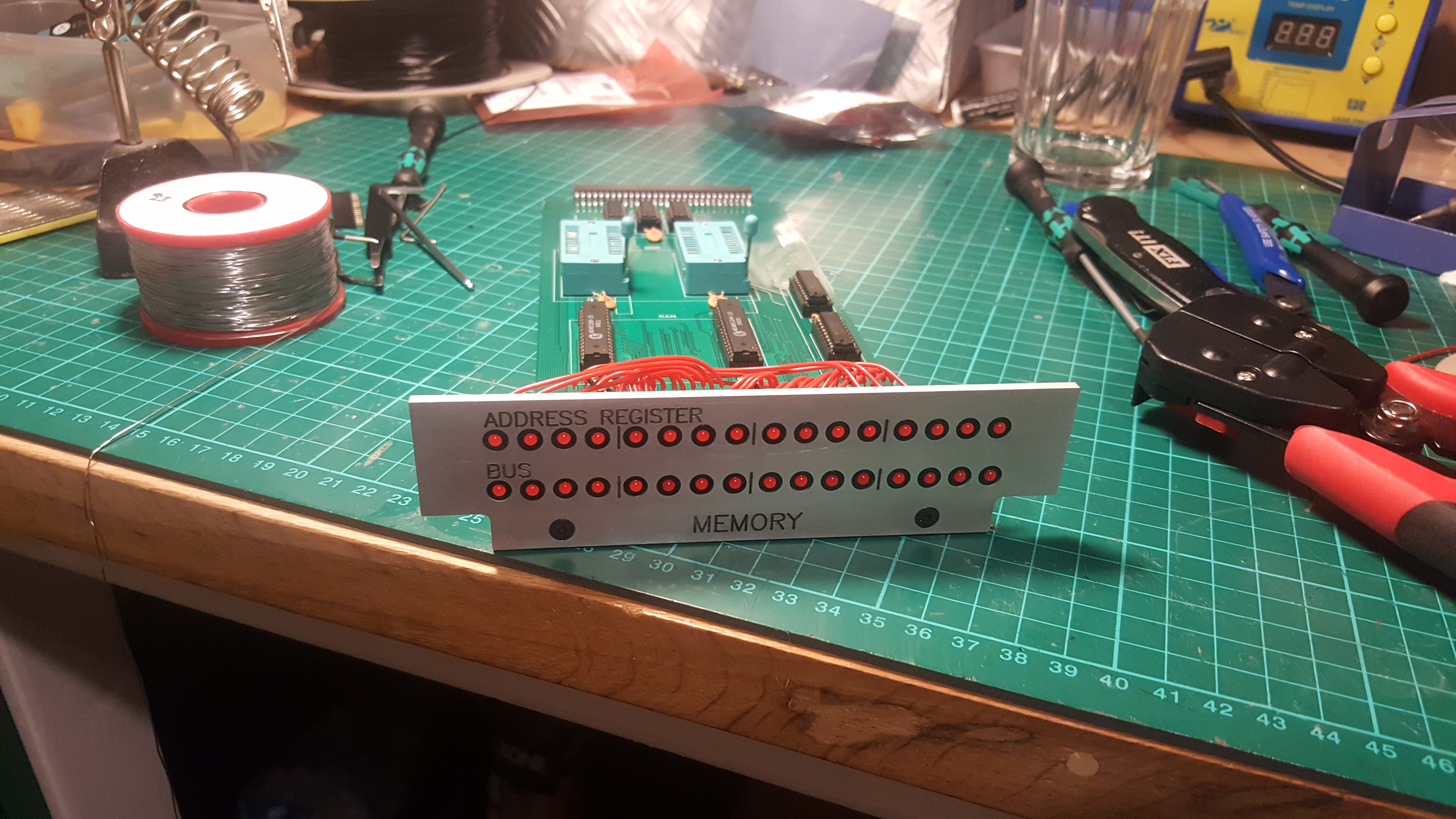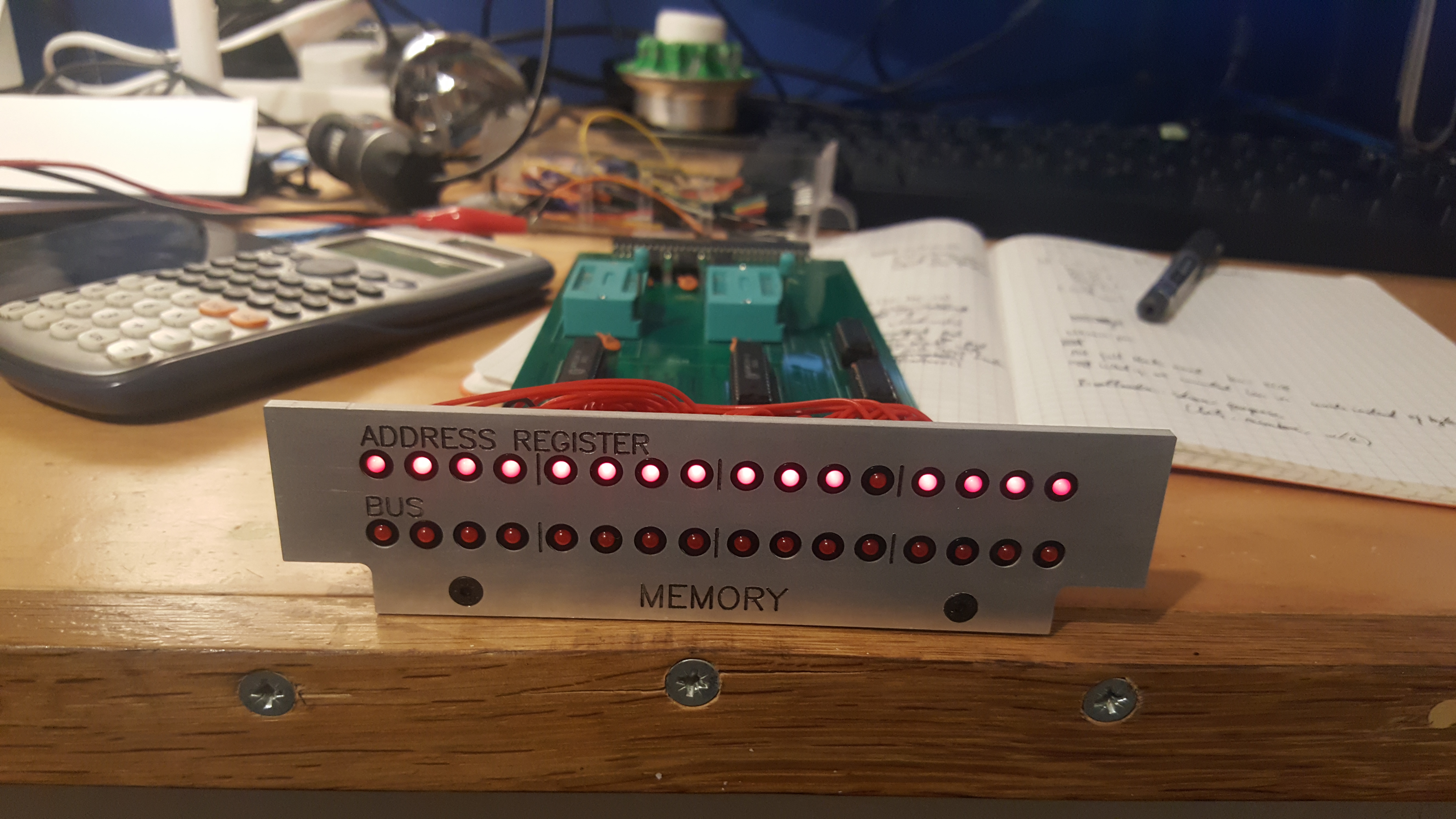 I've put together the memory card for the SCAMP CPU, including the front panel with LEDs to show the bus contents and address register.