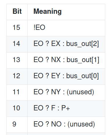 The "bus_out" decoding is slightly more complicated than "bus_in". One of the components that can output to the bus is the ALU, but the ALU also needs 6 more control signals to select its operation, which are all inapplicable when the ALU is not in use. For this reason, the bit that selects the ALU (EO) is separate from the "bus_out" bits, and the "bus_out" bits overlap with the ALU function selection:
