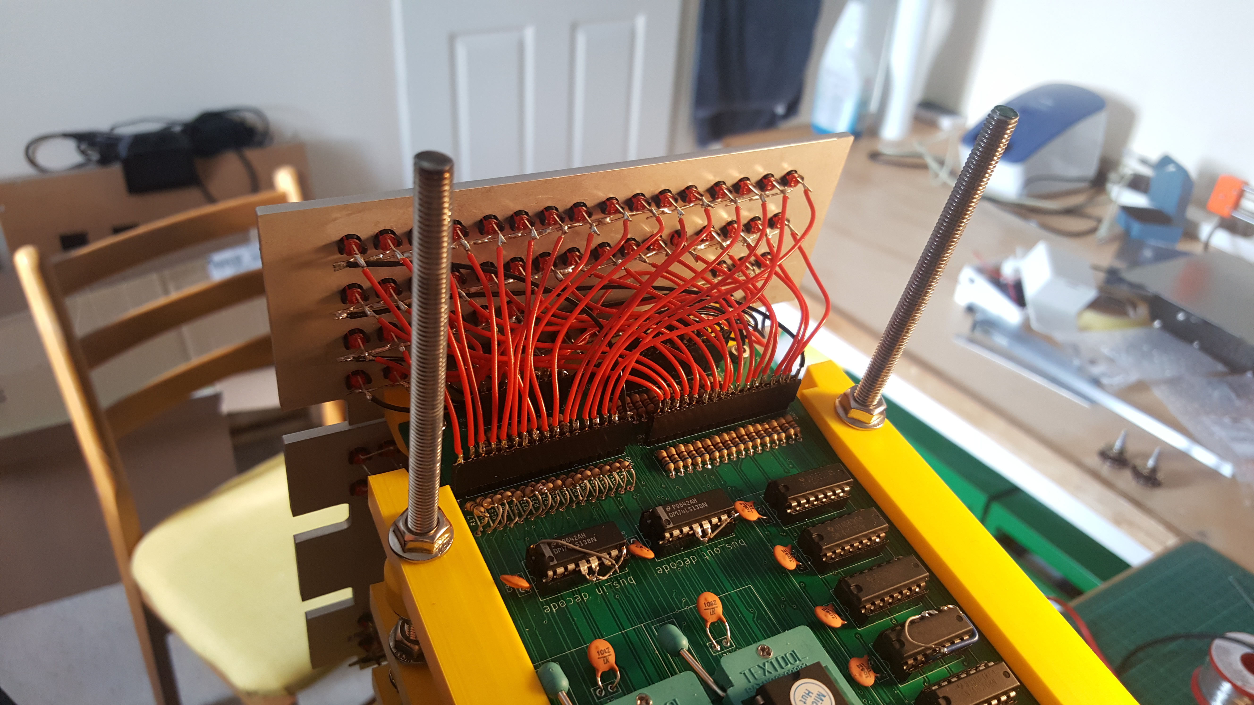 I still haven't made a clock, so for now the CPU is being clocked by a short Arduino program. I've gone up as high as 10 Hz without observing any instability. I don't yet have any way to infer the state of the machine without looking at the LEDs, so if it went any faster than that I wouldn't even know whether it was working or not. Next steps are to make an adjustable 555 timer-based clock, and interface with the 8250 UART.