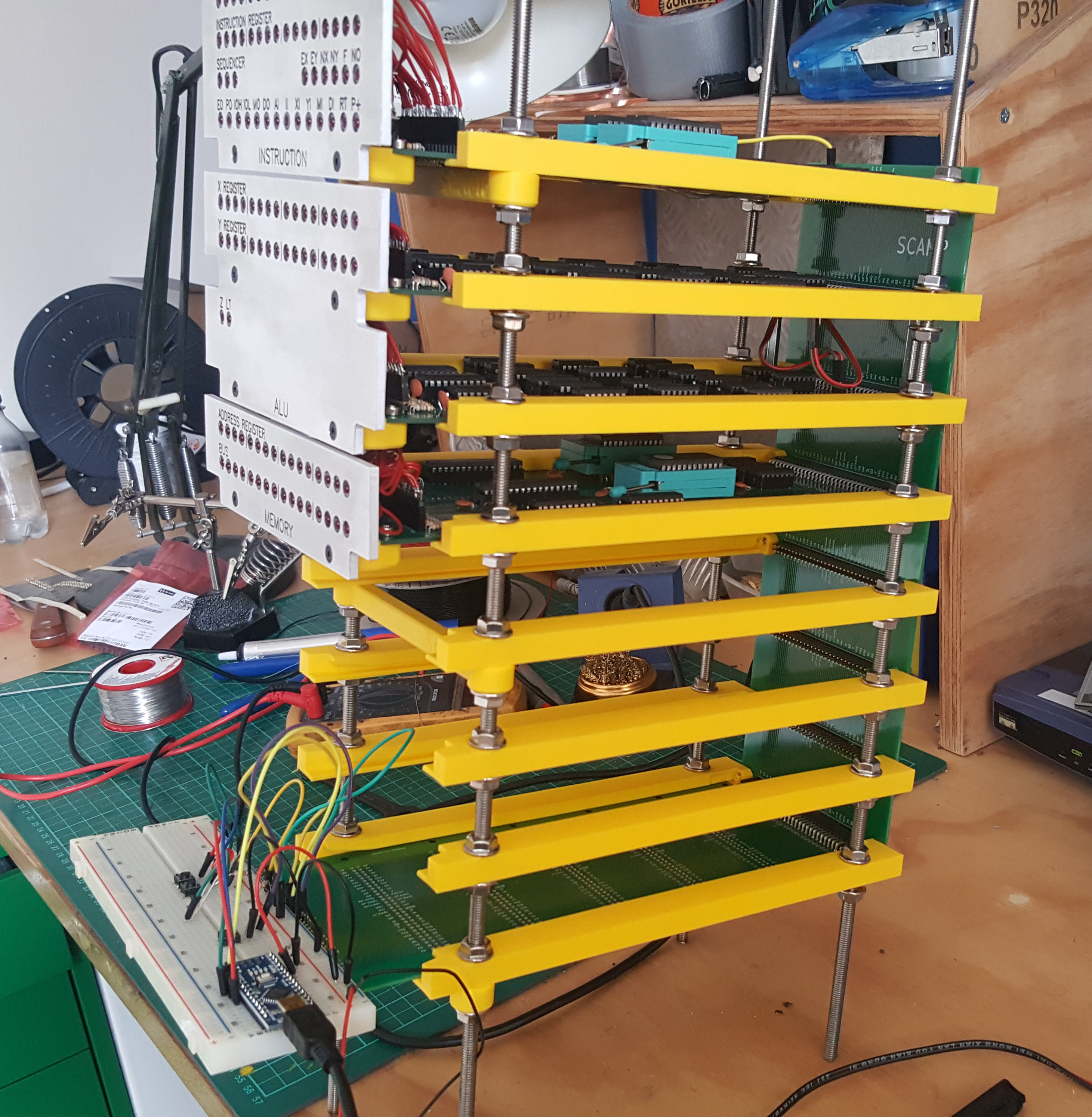 Although I had already checked that everything would work at least 3 different ways (Verilog simulation, running on an FPGA, and the SCAMP emulator in C), there were still a lot of fun bugs to find and fix after I put the PCBs together.