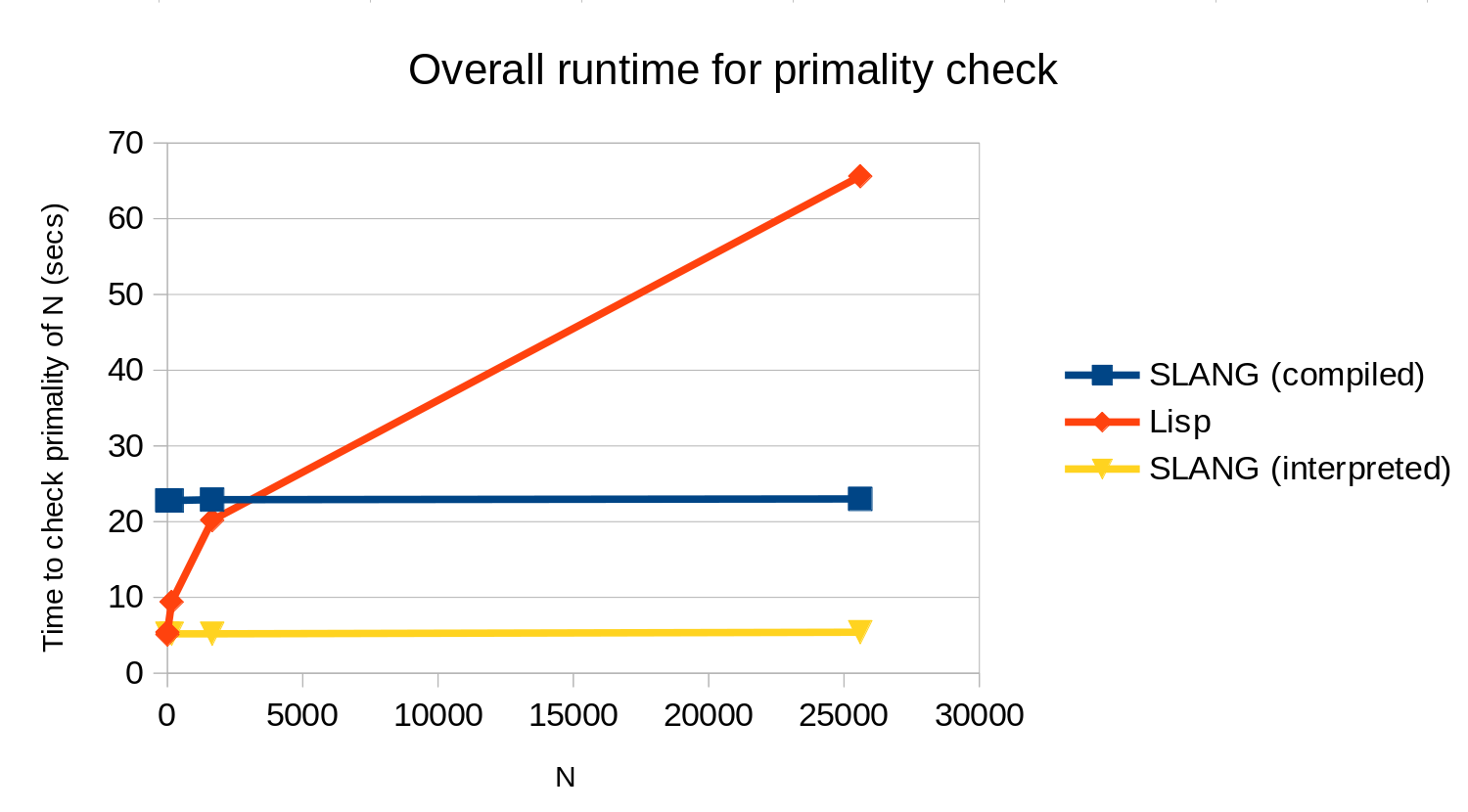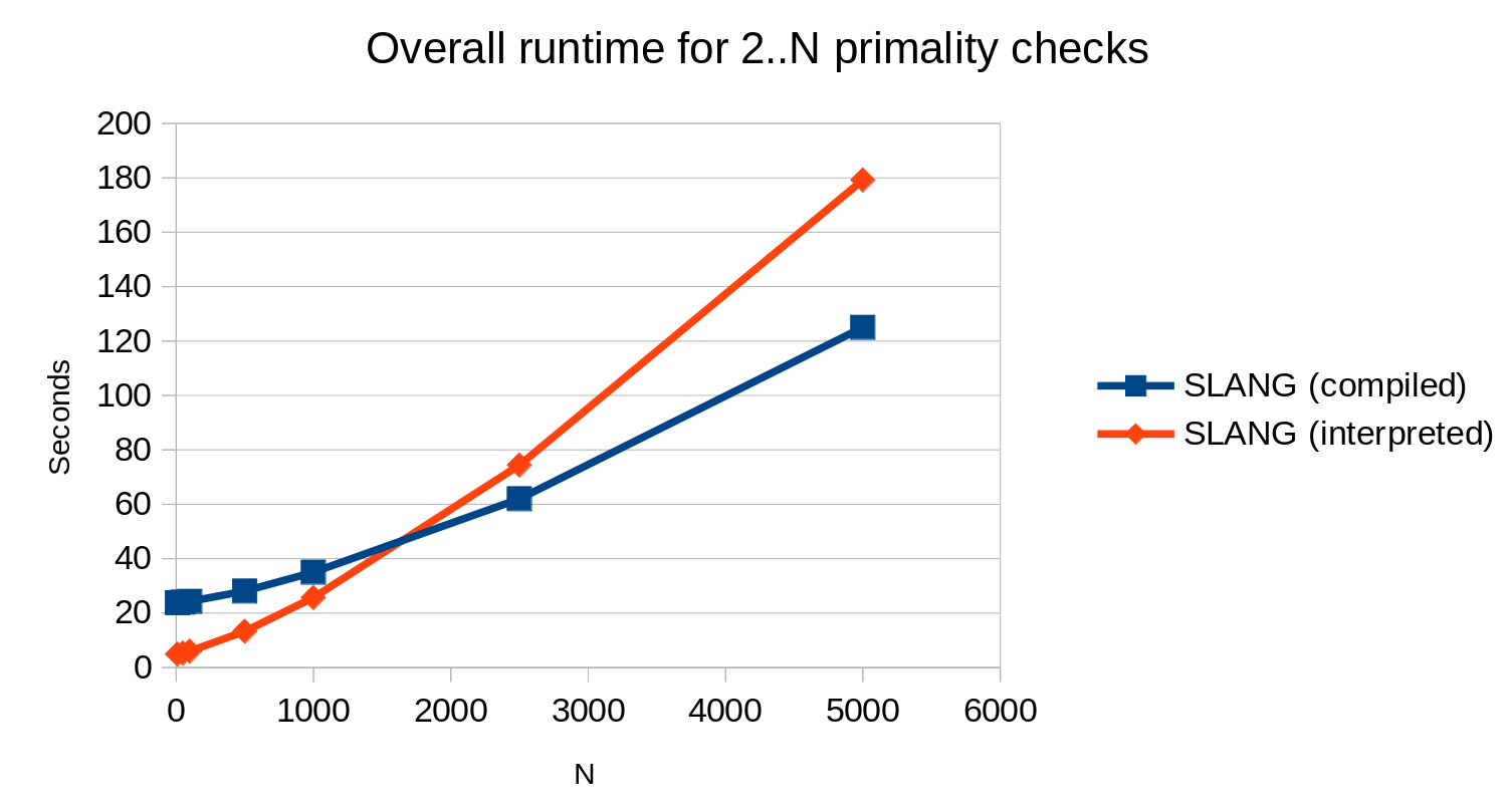 We can get a better idea of the differences between the compiled and interpreted SLANG implementations if we compare the overall runtime for a more complex program. This one naively calculates primality of all integers from 2 to N: