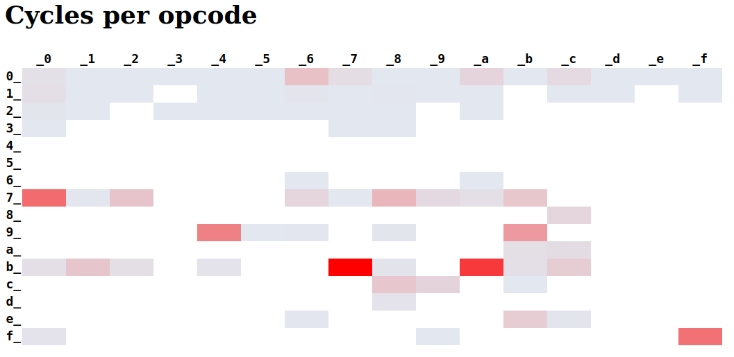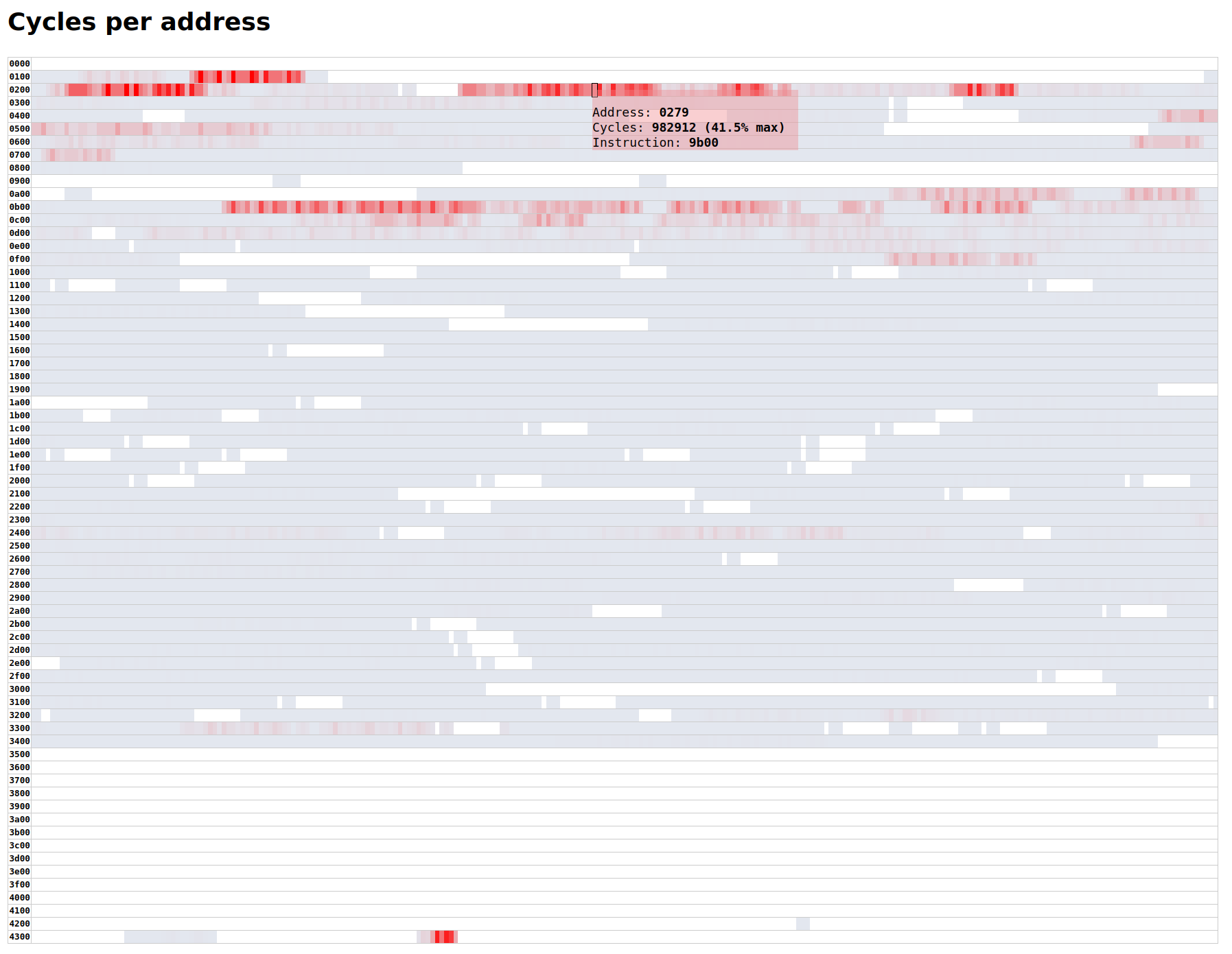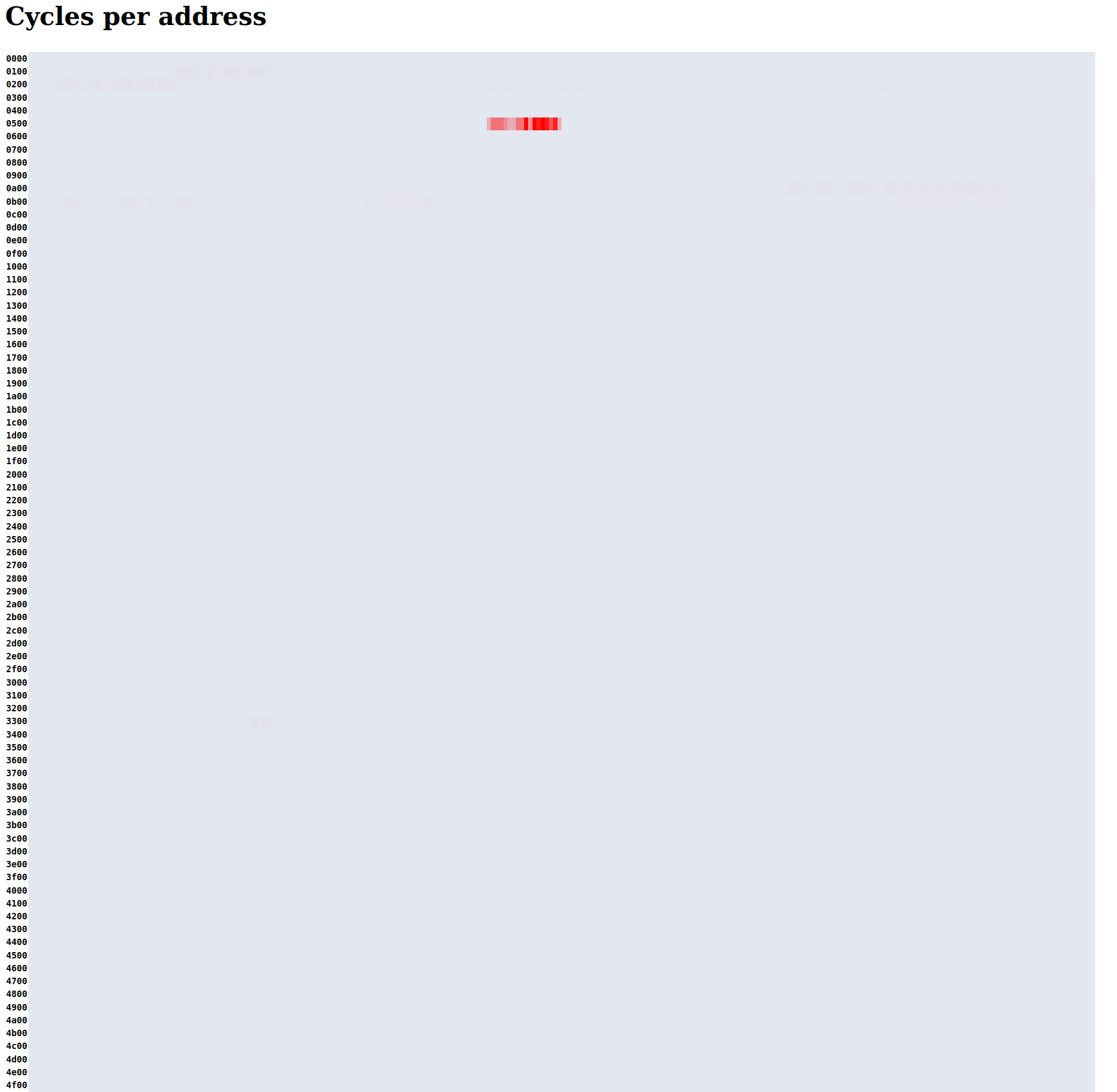 And at every memory access, the emulator increments a read or write counter for the accessed address. When running with -p, the emulator writes this data out to a file after the program has halted, and profhtml turns this into a slightly-interactive HTML report.