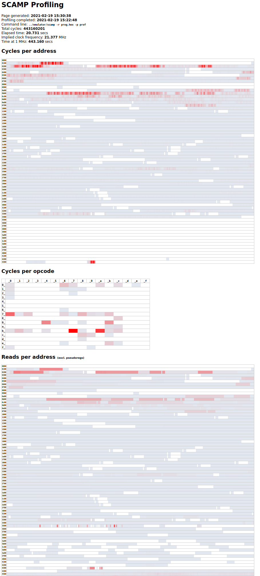 I've also added a "profiling" feature to the SCAMP emulator. This collects data on how much time is spent at each address, how much time is spent on each instruction opcode, and how many reads/writes are done to each address, and generates HTML reports like this: